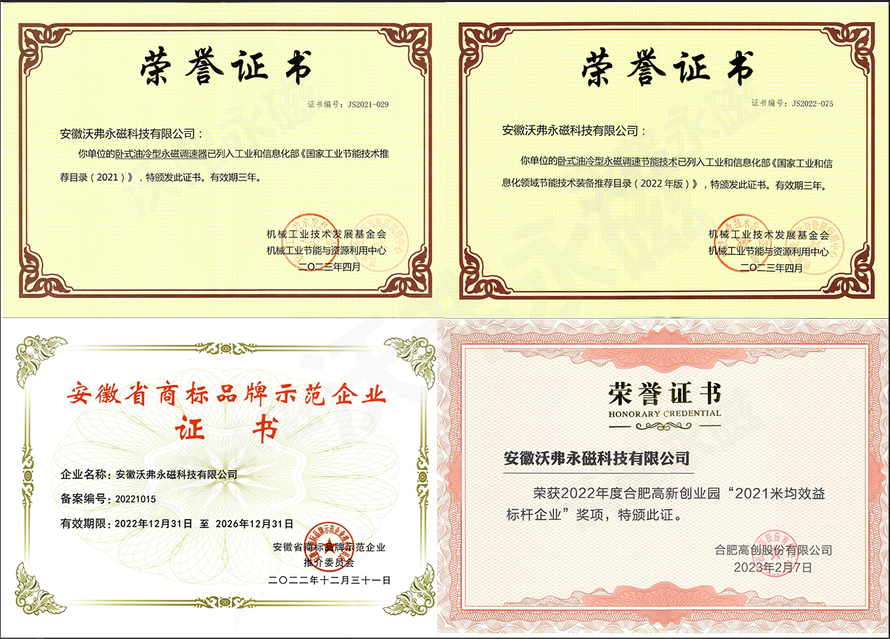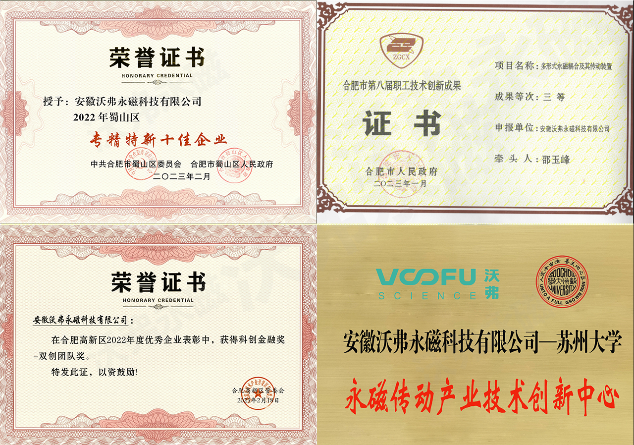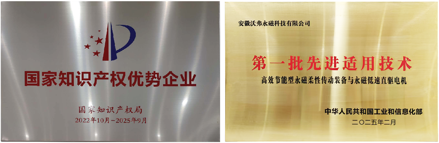 公司已获得国家高新技术企业、国家专精特新小巨人企业、国家知识产权优势企业、国家首批先进适用技术、安徽省商标品牌示范企业、瞪羚企业、深科技企业、省级专精特新企业认定,ISO质量、环境和健康三大国际体系认证工信部两化融合贯标认证;产品获得国家防爆合格认证、国家一级能效认证、国家3C产品认证、矿用产品安标认证和省新产品认定,并持有安全生产许可证。公司申报各项专利300余项(有权近200项)、参与3个国家标准研制、主导2个行业标准研制。其中发明近百项,获得省级专利奖3项,并保持每年20件以上的专利增长。公司还获市知识产权管理规范企业认定、省级专利奖;自主发明专利产品进入工信部国家工业节能技术、全国电子节能环保优秀推荐产品技术.安徽省重大技术装备首台套和省级服务型制造示范企业认定、工业领域节能环保产业“五个一百”推介目录和军民融合产品技术推荐目录。项目在全国多个双创大赛中斩获金银奖项和多地招才引智项目扶持,得到社会各界的高度认可和赞誉沃弗永磁作为科创新势力,已引入多轮战略投资;并在国家级高新区内自建有研产生产基地3万平方米,投资数千万元购建各类生产试验设备。沃弗始终坚定不移地行进在专精特新道路上,围绕永磁传动主业,以工业电机节能、为全社会节能降碳为使命,深耕不缀,并致力成长为中国永磁驱动和传动技术第一股。