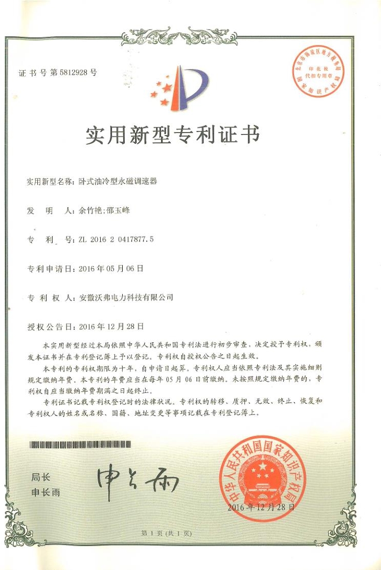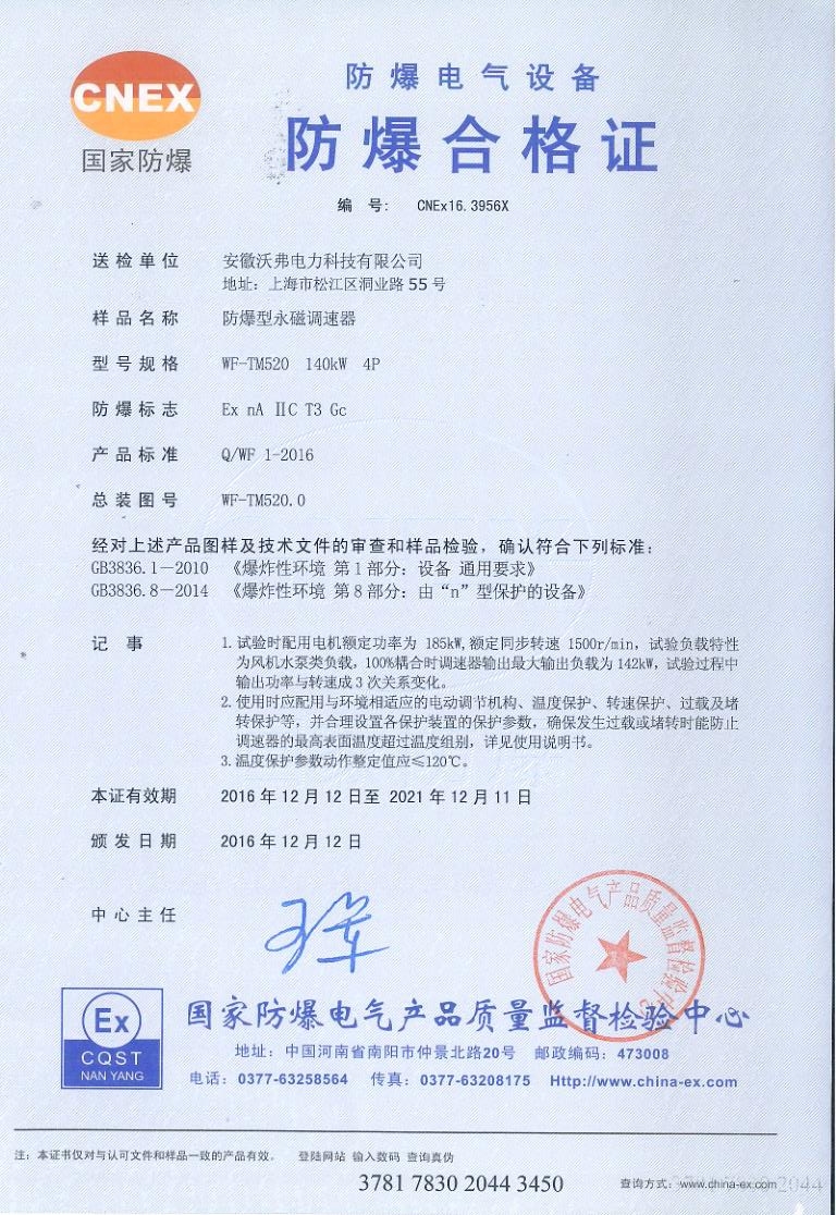 2017年沃弗永磁科技有限公司新能源科技创新进入白热化状态。沃弗永磁凭借往年在自主创新方面的突出表现,2016年荣获客户好评度优秀、产品安全系数优秀、节能效果优秀的新能源永磁产品。沃弗于2016年10月获取防爆证证书。此证书也是对沃弗永磁产品的高度肯定,也是对沃弗电力科技有限公司继续坚持走创新驱动发展道路的鼓励和鞭策。