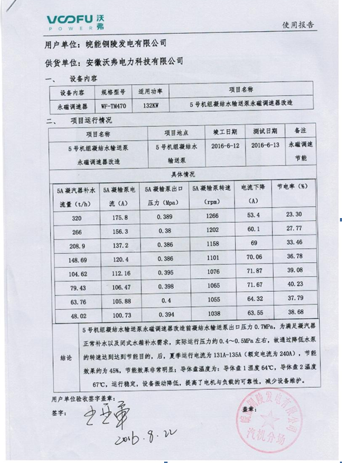 3、#5机组凝输泵共2台,一备一用,改造其中1台,永磁调速器型号为空冷型WF-TM470,电机参数为132KW/1480rpm/380V。