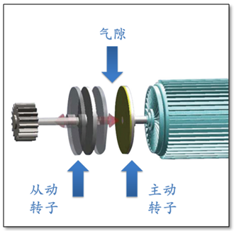 永磁耦合器是透过气隙传递转矩的革命性传动设备,电机与负载设备转轴之间无需机械连结,电机旋转时带动导体主动转子在装有强力稀土磁铁的磁盘从动转子所产生的强磁场中切割磁力线,因而在导磁盘中产生涡电流(Eddy Current),该涡电流在导体主动转子上产生感应磁场,感应磁场和永磁场之间磁性的相互吸合和排斥拉动从动转载,从而实现了电机与负载之间的转矩传输。