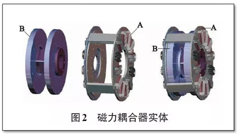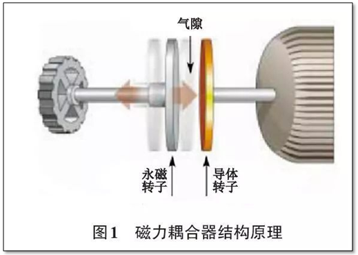 磁力耦合器的选型及注意问题,磁力耦合器也称磁力联轴器,主要由连接在电动机轴端的导磁体和连接在负载端的永磁体两部分组成。在运行中,按照涡流感应原理,以上两部分相对运动产生磁场,而这样在盘状导体中就会产生涡流,而涡流所产生的磁场和磁体相互吸引,从而使转子和导体两个部件通过空气间隙传递力矩,这样电动机和负载就由原来的硬连接转变为软连接[1],如图1和图2所示。