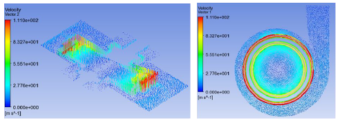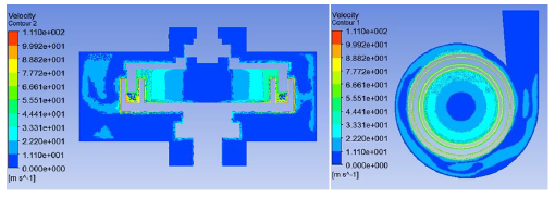 永磁调速器的封闭模型如图5-2 所示,通过对永磁调速器的封闭模型进行数值模拟,永磁调速器在运行状态稳定的情况下,导体转子的转速为3000rpm,导体转子边缘的线速度达到129.5m/s,和导体转子接触的空气流体的流速最大,达到112.02m/s,如图5-3为永磁调速器原模型轴截面和横截面的速度矢量图,可见靠近导体转子壁面的空气流体的流速接近且小于导体转子的流速,说明模拟结果可靠性高。