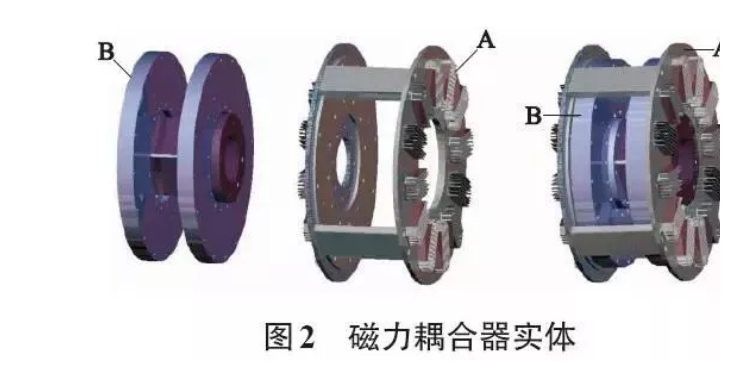 磁力耦合器也称磁力联轴器,主要由连接在电动机轴端的导磁体和连接在负载端的永磁体两部分组成。在运行中,按照涡流感应原理,以上两部分相对运动产生磁场,而这样在盘状导体中就会产生涡流,而涡流所产生的磁场和磁体相互吸引,从而使转子和导体两个部件通过空气间隙传递力矩,这样电动机和负载就由原来的硬连接转变为软连接[1],如图1和图2所示。