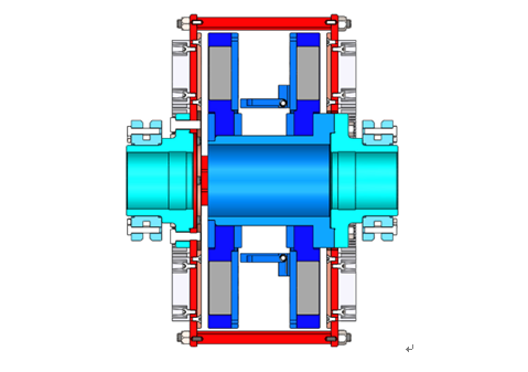 限矩保护原理:当设备启动时,磁盘会由于排斥力作用自动远离导体盘弹开,内转子上的弹簧拐臂会顶住磁盘切割磁场,满足重载设备的大扭矩负载启动。启动完成后,转速超过500rpm时,在高转速情况下,弹簧拐臂由于离心力的作用会被甩开,满足正常运行的出力要求。当负载过负荷或部分过负荷时,永磁耦合器的盘间产生相互排斥的力,从而内外转子间隙放大,过负荷达到1.8倍时会部分弹开,当过负荷达到2.5倍时磁盘会被完全弹开,内外转子气隙达到最大,电机空载运行,从而达到保护皮带机系统的目的。