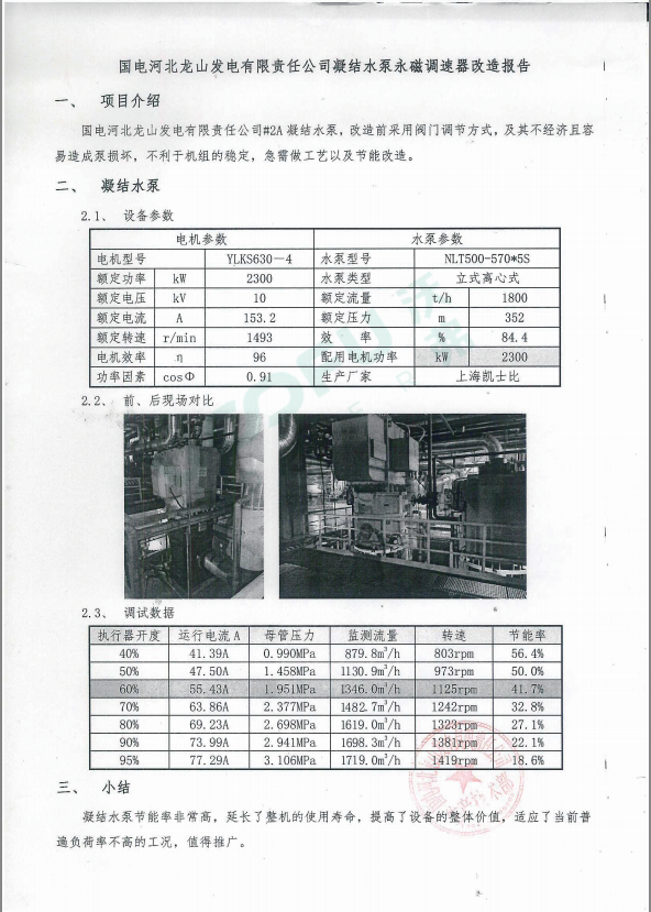 首页 > 项目报告 > 国电河北龙山发电有限责任公司(凝结水泵)永磁调速器改造报告