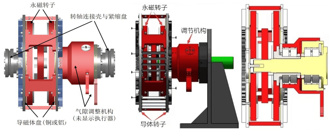 永磁调速器是利用用磁盘和导体材料感应磁场的相互作用力产生转矩,且通过调节永磁体和导体之间的气隙就可以控制传递的扭矩,从而实现负载的转速的调节。感应磁场是通过磁体和导体之间的相对运动产生的,电机的转速不变,会随着负载的转速的变化而变化。可实现刚性传动变为柔性传动,实现机械式无极调速。